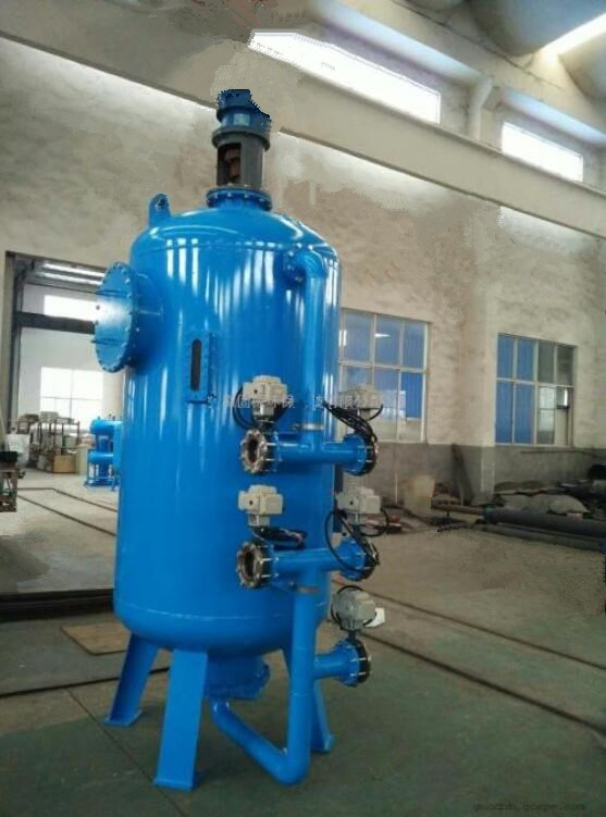該型過濾器過濾時濾液高進低出,反洗時反洗 水低進高出,反洗水不間斷,清水消耗量大;攪拌 槳葉采用標(biāo)準(zhǔn)直葉片或斜葉片,對濾料傷害大,槳 葉一般不反轉(zhuǎn),使纖維球和水流同向旋轉(zhuǎn)運動,導(dǎo)致反洗水對濾料沖洗力不大,濾料不易洗凈。