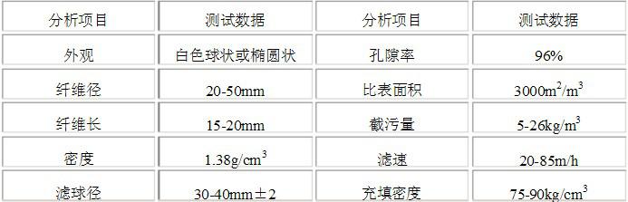 96%,充填密度50kg/cm3,比表面積3000m2/m3。改性纖維球絲徑細(xì),比表面積大,比表面積高達(dá)2000m/g。由于纖維絲徑細(xì)的特點(diǎn),它疊加后濾層孔隙小,而疊加后濾層孔隙度在80%以上,對懸浮物的攔截作用比其他濾料都優(yōu)良,因此對低滲透油藏的注入水處理尤為理想;對高懸浮物水的排放和回用有要求的過濾更加適用。